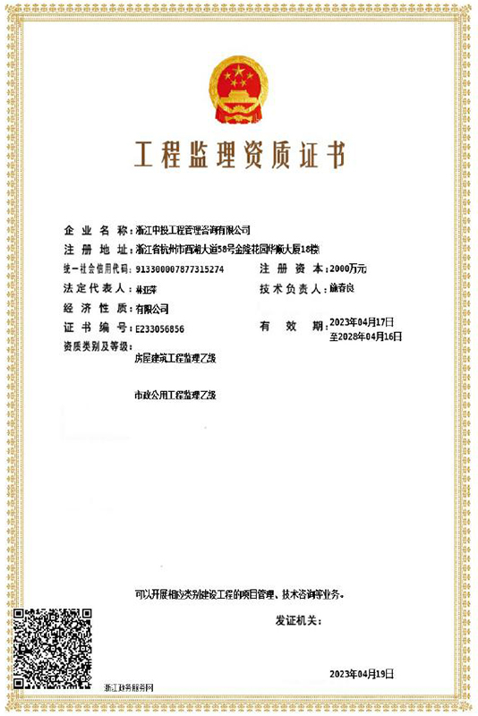 2023年4月17日,浙江中投工程管理咨询有限公司荣获房屋建筑工程监理乙级、市政公用工程监理乙级资质证书。