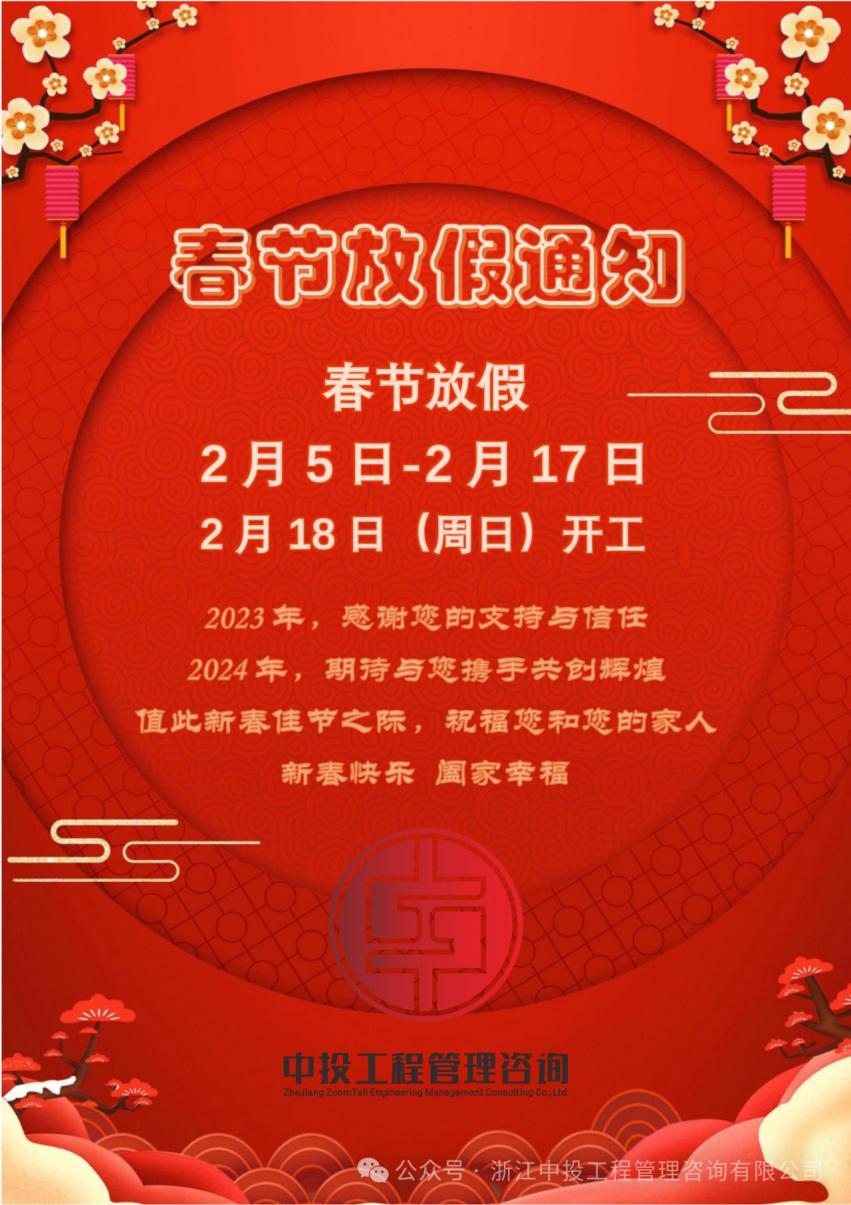 春节将至,浙江中投工程管理咨询有限公司现就 2024 年春节放假安排通知如下: