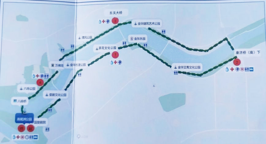 毅行活动从燕尾洲公园出发,沿婺江绿道,途经婺剧文化公园、古渡公园、艾青文化公园,后经康济桥(便桥)后过江折沿建筑艺术公园、清风公园、八咏公园、彩虹桥回燕尾洲公园。整个毅行行程约10KM。