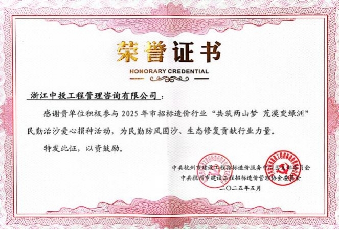 2025年3月5日,在第47个植树节到来之际,中共杭州市建设工程招标造价管理协会委员会及中共杭州市建设工程造价服务中心总支部委员会联合发起了“共筑两山梦 荒漠变绿洲”倡议书。浙江中投工程管理咨询有限公司再次积极响应此次“民勤治沙造林活动”,共同为增加绿色植被覆盖、保护生态环境贡献一份力量。